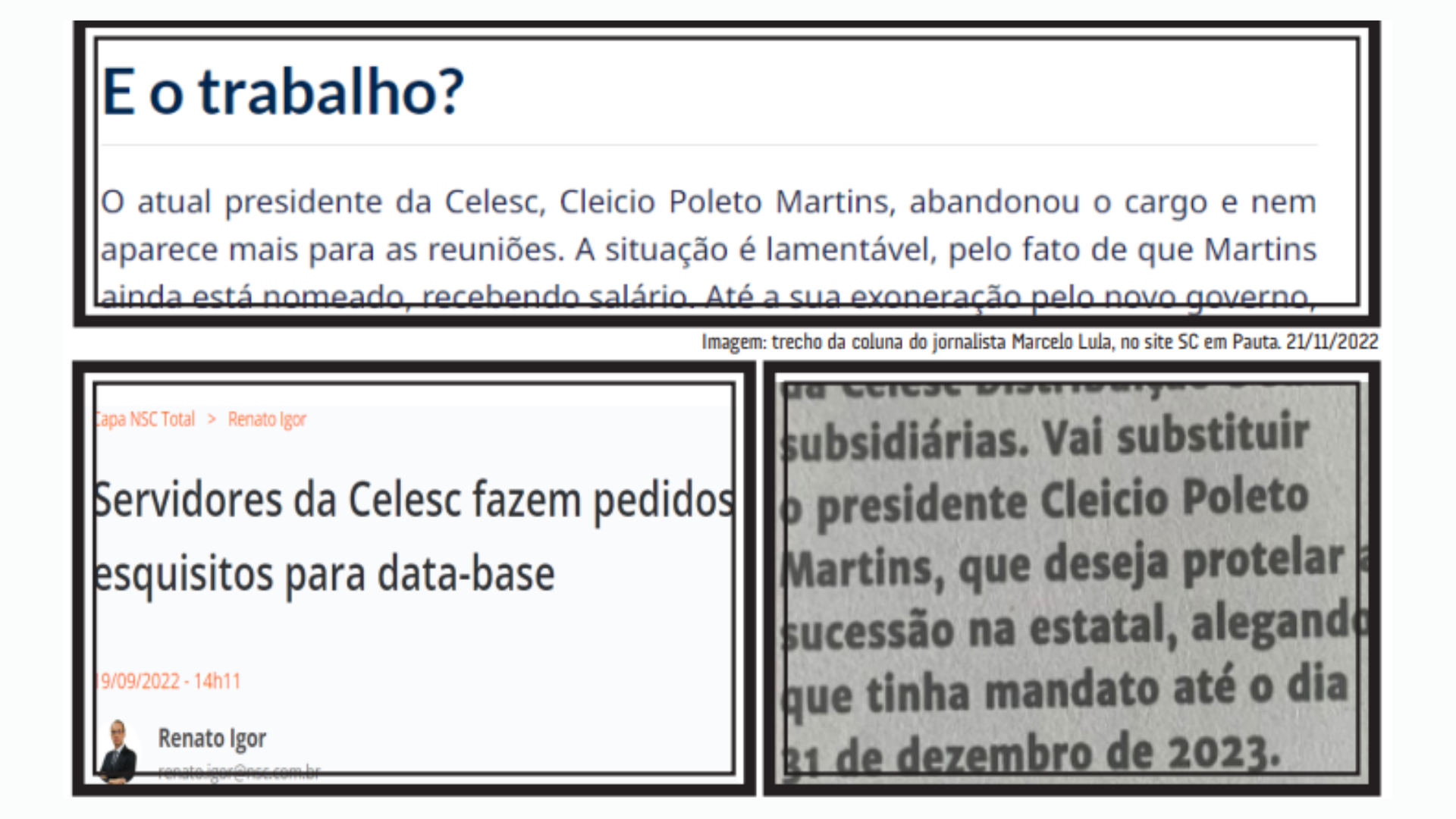 Até mesmo na hora de ir embora Cleicio fez com que a Celesc virasse notícia por polêmica. O desafio do novo governo eleito e da nova direção da empresa será reerguer, reestruturar e valorizar a equipe de Comunicação e a imagem da empresa. A Celesc tem inúmeros motivos para figurar diariamente nos meios de comunicação com bons resultados à população, com investimentos, bons números operacionais e contábeis, com inúmeras melhorias que beneficiam a vida da população catarinense.