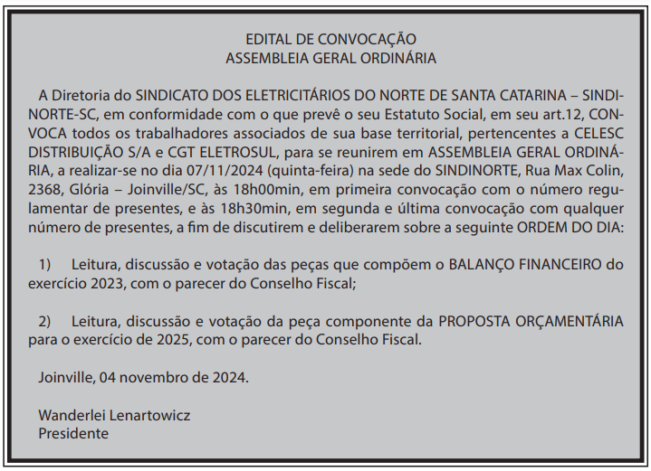 No dia 07/11 será realizada, na sede do Sindinorte, em Joinville, a Assembleia de prestação de Contas do ano de 2023. A Assembleia é aberta aos trabalhadores sindicalizados e representa uma ampla transparência da gestão dos recursos dos trabalhadores na luta em defesa da categoria eletricitária e das empresas públicas de energia elétrica de nossa região. A Diretoria do Sindinorte convoca os trabalhadores da Celesc e da Eletrosul para a assembleia que tem início as 18h, em primeira chamada, conforme edital abaixo. Participe! Juntos somos mais forte!