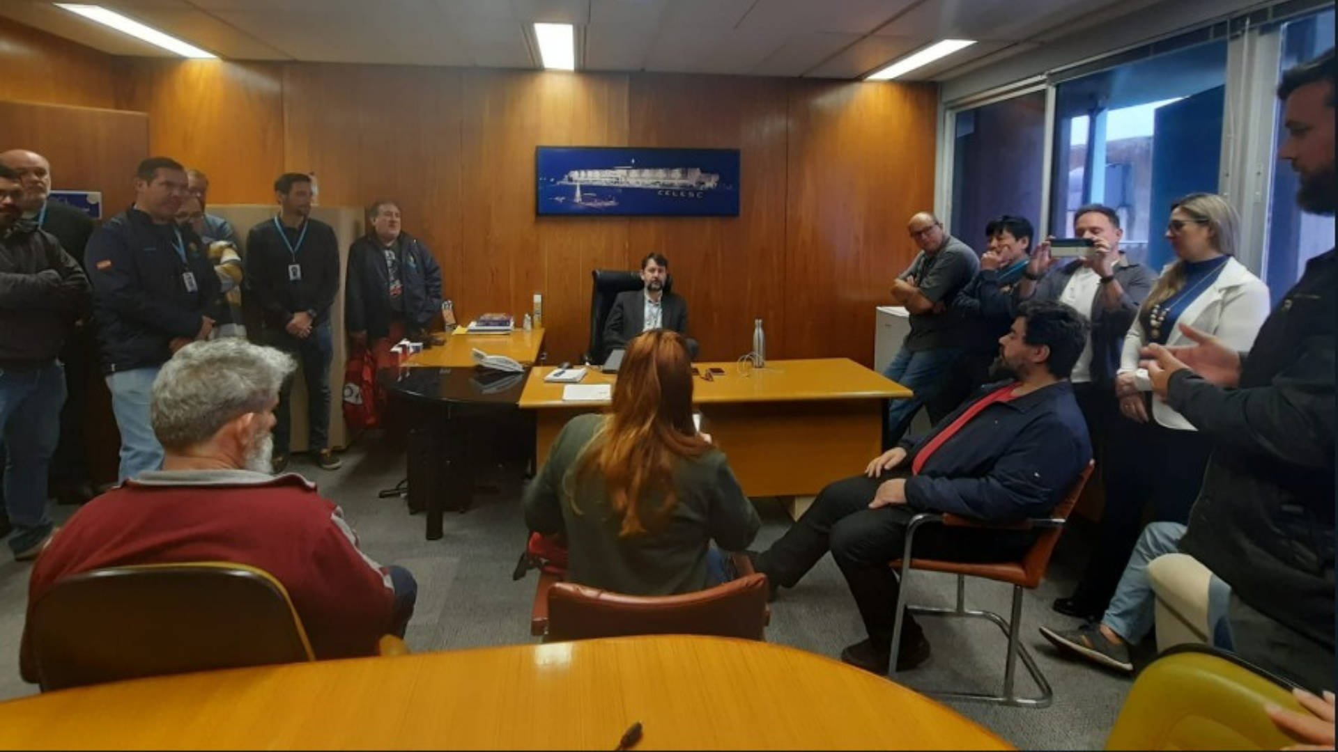 Um grupo de cerca de cinquenta trabalhadores (dos mais diversos departamentos da Administração Central) e dirigentes sindicais passou em cada uma das salas dos Diretores e fez falas apelando para o bom senso e para a preservação da imagem da Celesc neste momento tão conturbado. Não apenas dirigentes sindicais, mas trabalhadores de diversos setores da empresa pediram esse cuidado por parte dos Diretores para que o tema fosse trazido na reunião da Diretoria Colegiada e para que a Deliberação que trata do assunto fosse revogada.