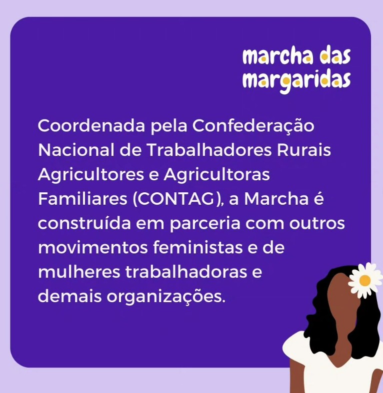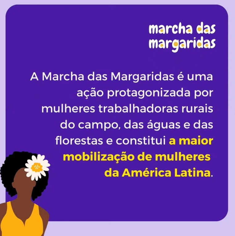 Considerada a maior mobilização de mulheres da América Latina, a Marcha das Margaridas está acontecendo nesta semana e prevê a participação de 100 mil mulheres rumo a Brasília. O nome da marcha é homenagem a Margarida Maria Alvez, sindicalista da Paraíba, que lutou por direitos de trabalhadoras e trabalhadores rurais e pelo fim do trabalho infantil. Foi assassinada em 1983, após ameaças de latifundiários da região.